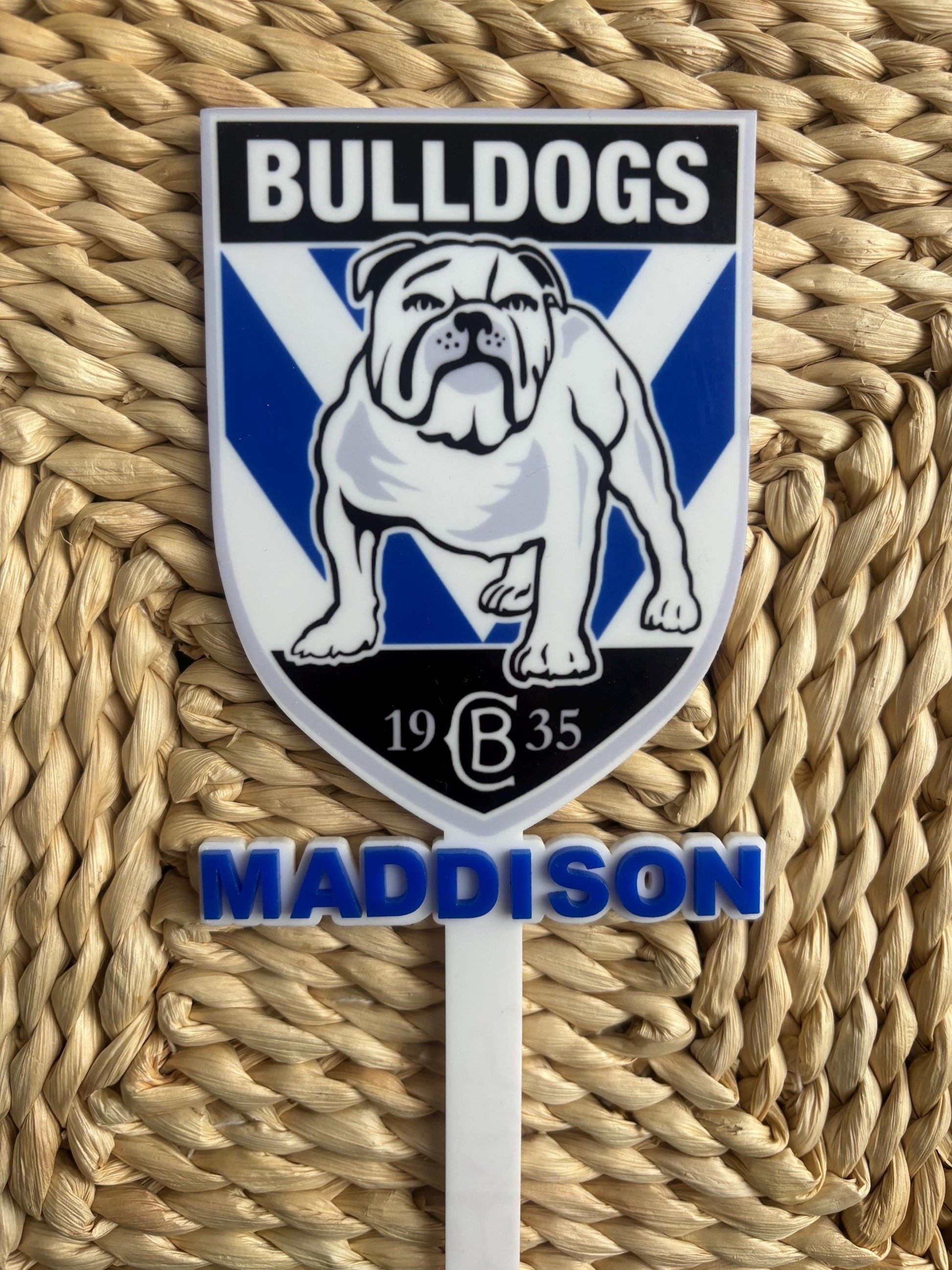 Celebrate like a true Bulldogs supporter! This custom NRL cake topper features the iconic Bulldogs logo and is personalised with any name and number – perfect for birthdays, fan parties, or themed events.