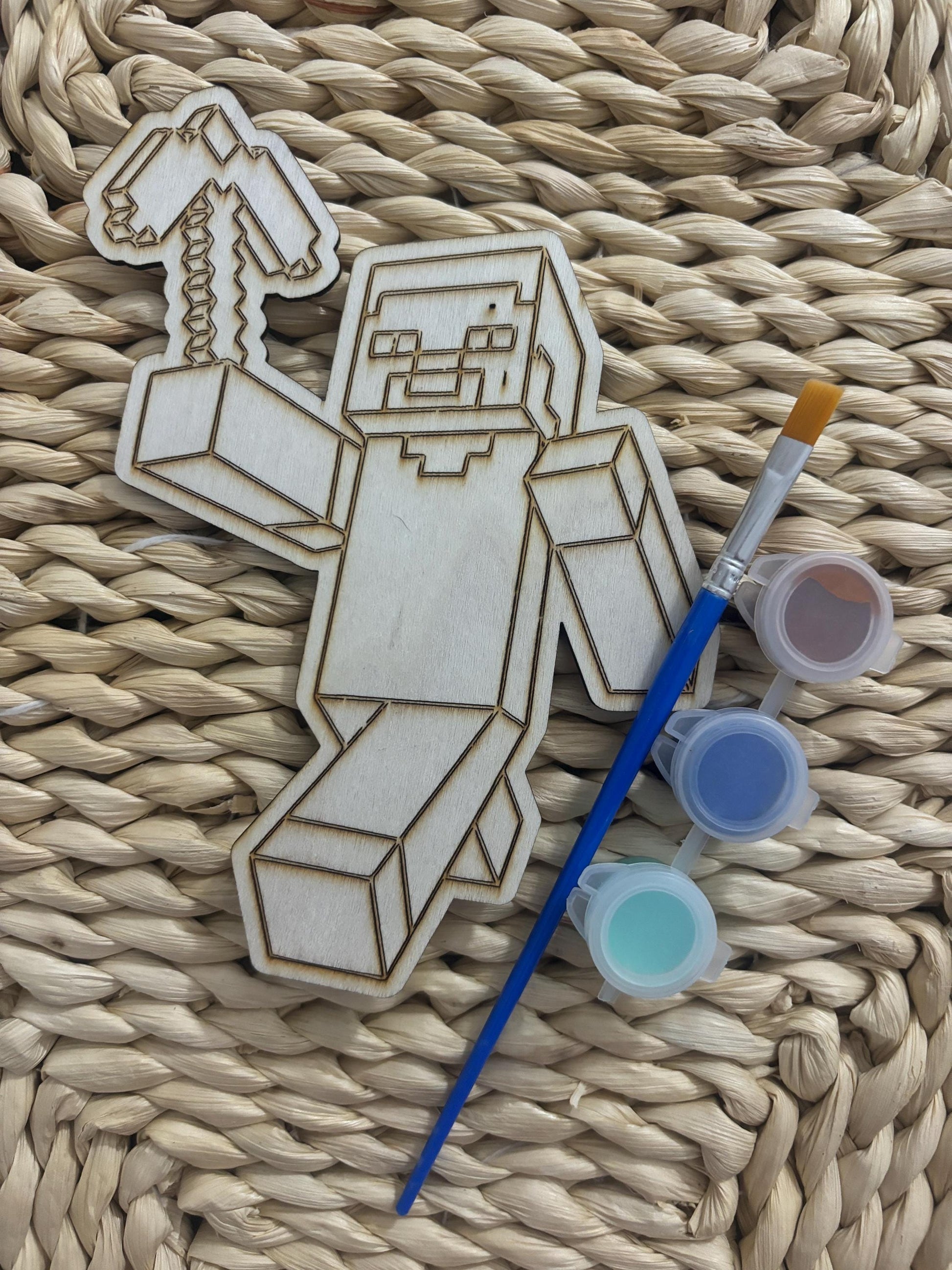 wooden characters for party favours, Minecraft, Spiderman, bluey and many more